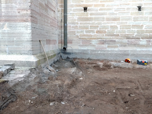 Närmast kyrkans murar kunde vi se en del av grunden till västligaste delen av långhuset och fyra strävpelare, samt till det lilla trapptorn som finns på kyrkans södra sida. I schaktet på kyrkans norra sida var grunden murad med kalkbruk, något vi inte såg på den södra sidan. I norr fanns dessutom mycket mer sten, både kalkstenar och gråstenar, i schaktet.